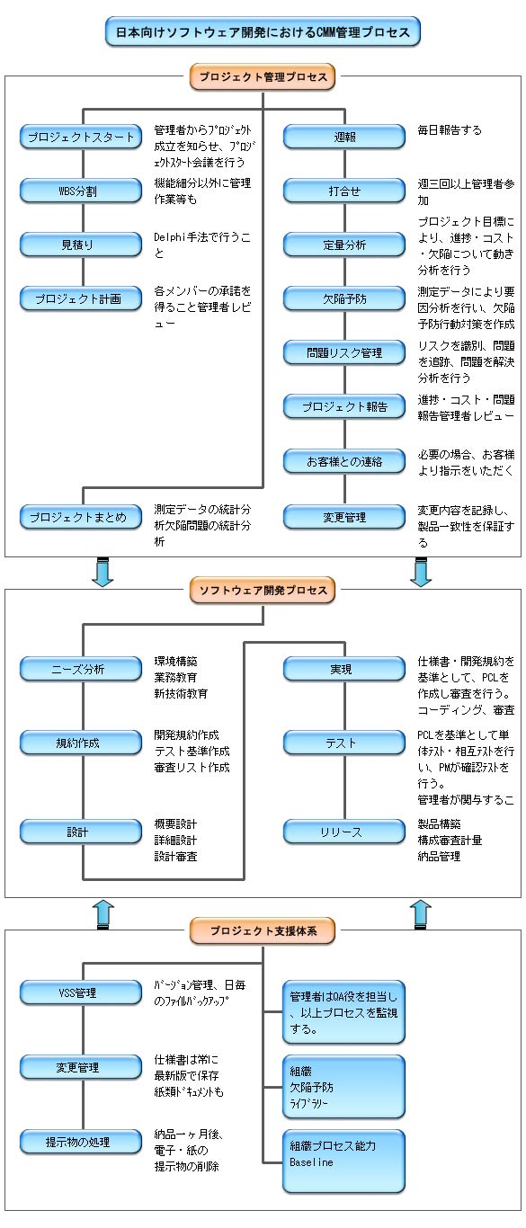 CMM(Capability Maturity Model):プロセス能力成熟度モデルで、5段階の成熟度から成ります。